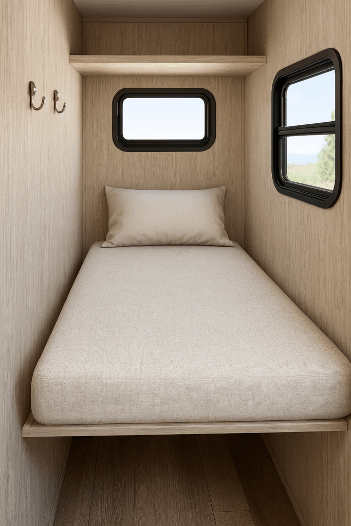 Natural light makes a huge difference in how a small trailer feels. I added windows on both the side and back of the single bed areas to make the space brighter and feel less enclosed. It’s also a nice touch for giving each person a view and some sense of personal space.