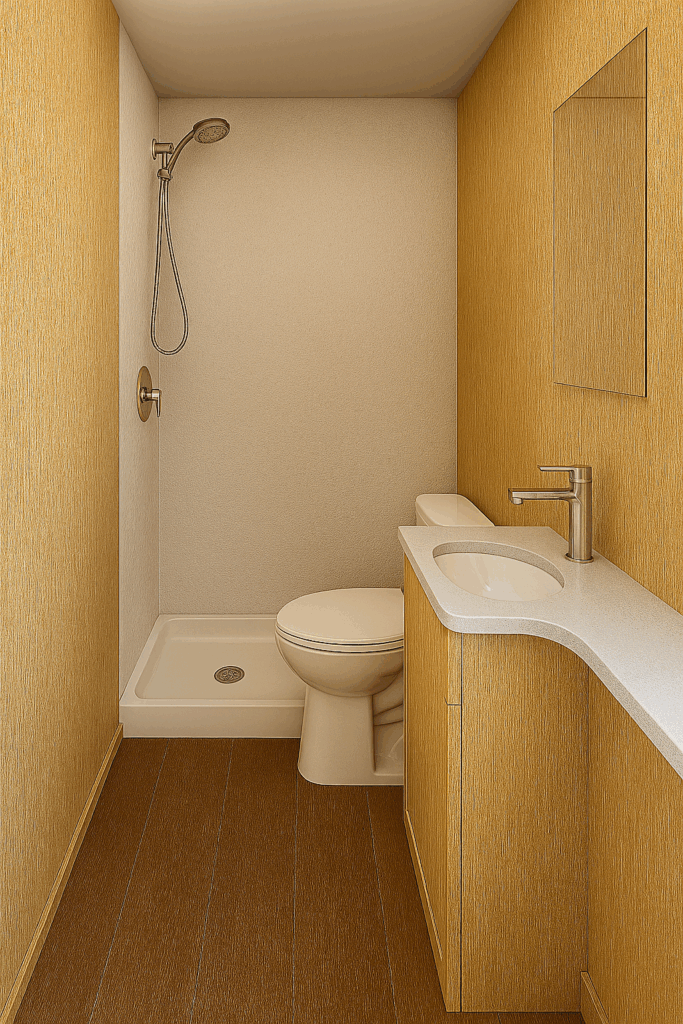 The bathroom design keeps things simple but efficient. It includes a small tub, toilet, and sink with counter space for personal items. The layout allows for privacy while staying compact enough not to take away from the main living areas.