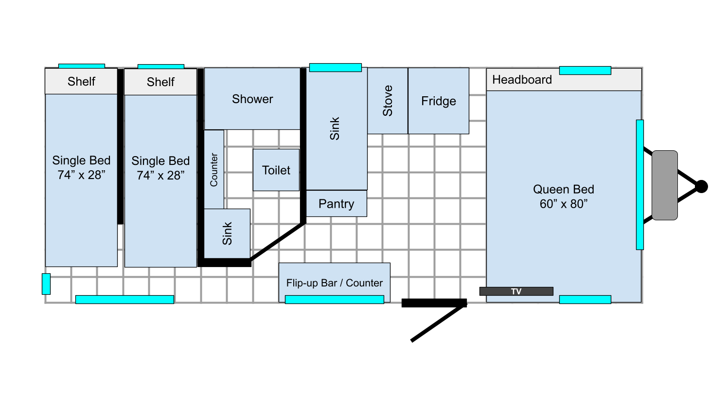 These two bed nooks could have lots of variation depending on how they are built. Instead of beds, they could each of a small laptop desk area which would transform the trailer from a family camper to a couples camper. Or, instead of single beds they can have bunks which would accommodate a family of six.