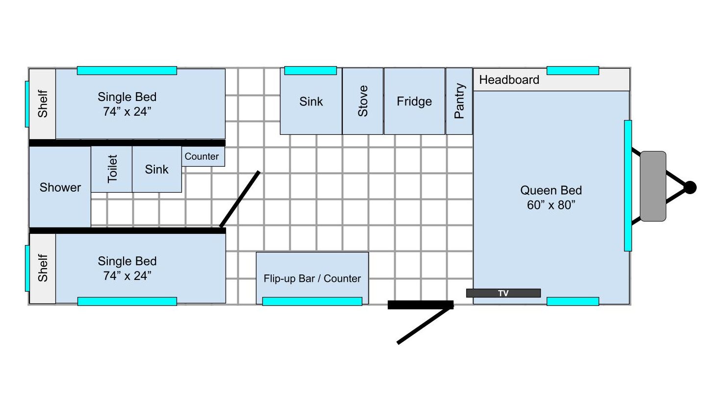 Each grid in the proposed floorplan above is designed to represent a 10″ x 10″ area. The total width of this model is 90″ wide or 7.5 feet. This is the internal width, so the overall width would likely be around 8 feet. The length is 230″ which is a little over 19 feet. Once the tongue is added in the overall length should still be under 23 feet.